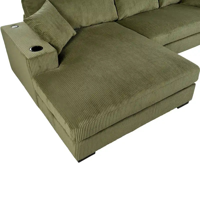 111-Inch Large Corduroy L Shape Sectional Sofa with Built-in Cup Holders & Charging Ports