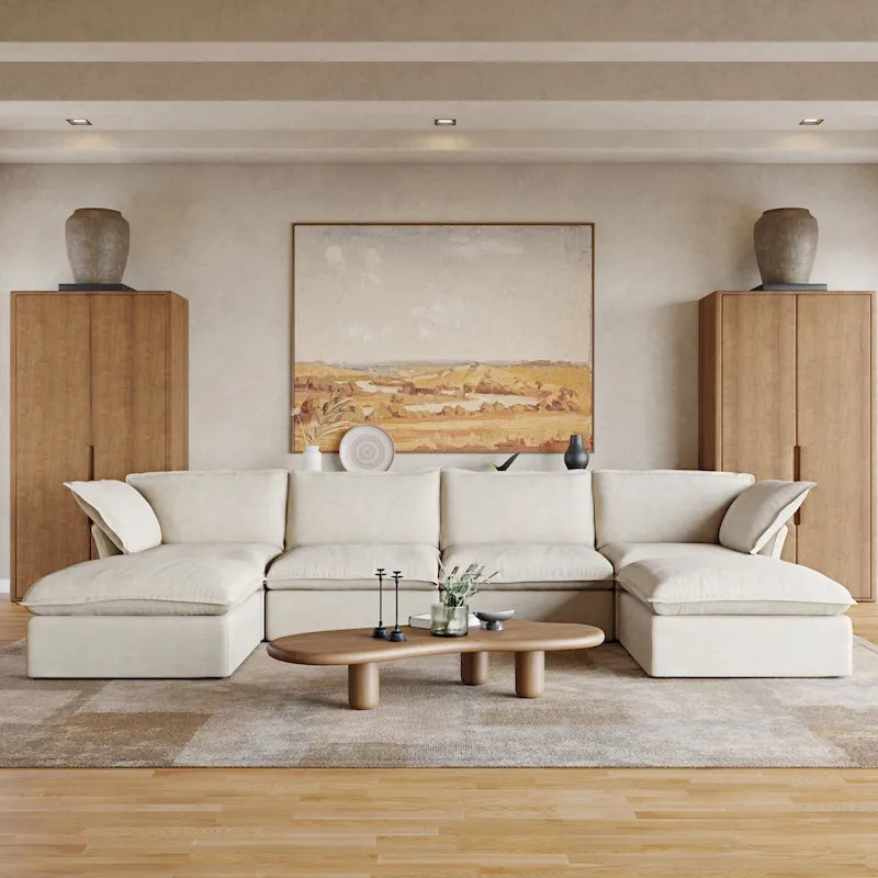 This 6 piece U-shaped sectional ties together your den, living room, or entertainment space. It features a modular and reversible design that can be easily recombined to suit your space. This sectional is crafted with a solid and engineered wood frame, and it rests on solid wood block feet. The feather-filled cushion provides a plush seating experience, supported by sinuous springs. The durability of the fabric keeps your furniture looking and feeling as beautiful as the day you brought it home.Best of all, removable cushions make cleaning easy.