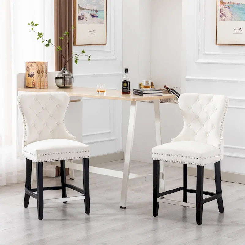 Indulge in the sophisticated charm of the Carter 24 Wingback Tufted Nailhead Counter Stool Set. With its luxurious velvet upholstery, diamond pattern button tufted back, and striking nailhead accents, this set of two counter stools is designed to elevate your dcor. Wrapped in a solid hardwood frame with a black finish, the stools feature a high-density foam cushion for an inviting and comfortable seating experience.