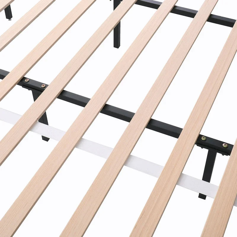 Made of engineered wood with 12 wooden slats and center support legs, eliminating the need for a box spring.
