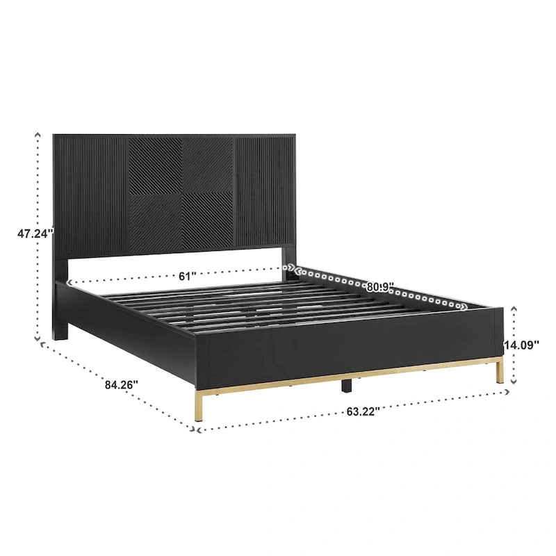 This low-profile queen platform bed is a gorgeous, traditional design with a modern twist. The carved chevron headboard adds texture and dimension to the bed with a black finish paired with gold metal finish legs that anchors your bedroom in understated glam style. The wood platform design saves you from having to buy a box spring or latex, foam, or spring mattress. The durable metal frame leg offers stability and support for the frame of this stunning bed. The lower bed is easier to get in and out of. This low-profile platform bed comes with everything you need for easy assembly.