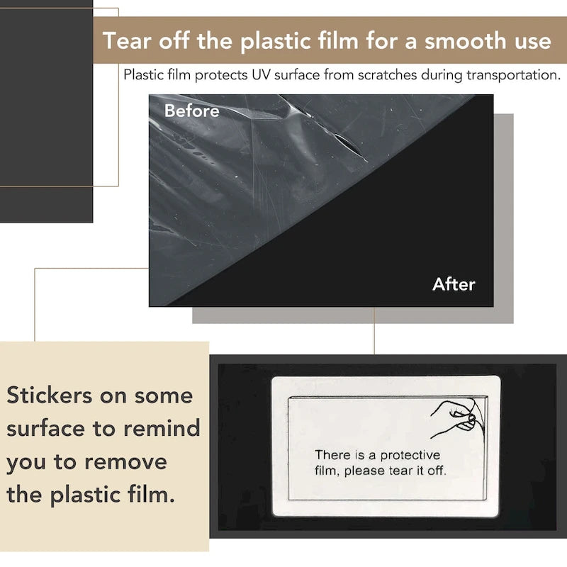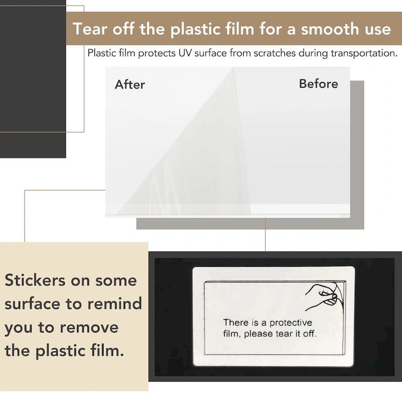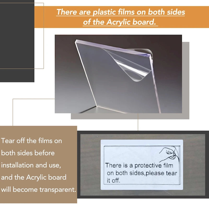 Notice There are plastic films on both sides of the Acrylic board. Tear off the films on both sides before installation and use, and the Acrylic board will become transparent.