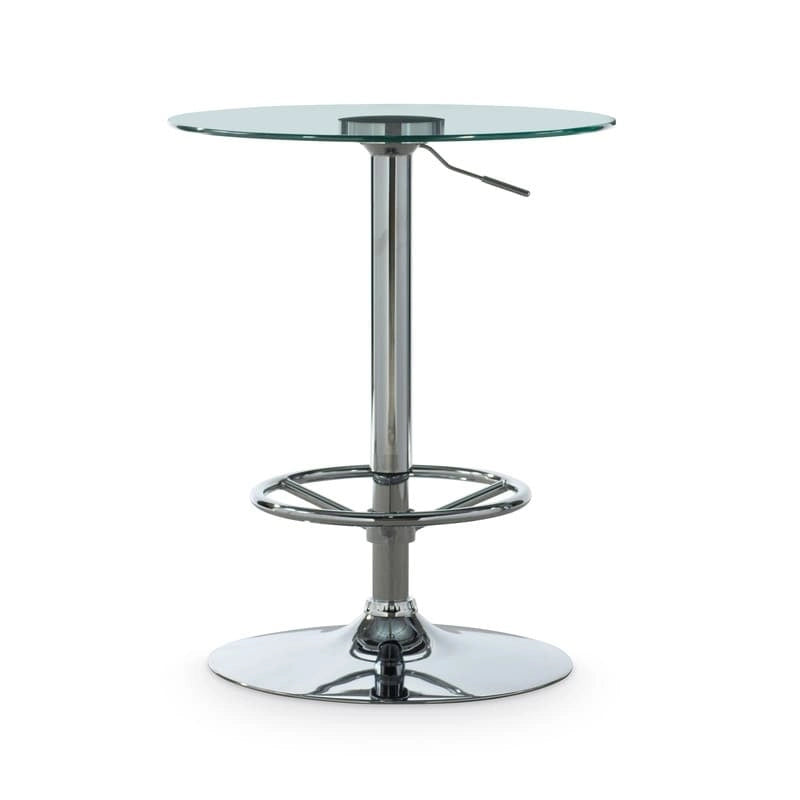 Craft a casual entertaining space in any corner of your home with this chic, modern pub table. Perfect for dressing up or down, it pairs a round glass top with a circular metal pedestal base finished in polished chrome. Designed to meet your styling needs, use the gas lift to raise and lower this accent table as it comfortably seats two. Foot rest is stationary, always in the right place. Make your next festive event even more marvelous by using this pub table as a high style beverage station, or use it to build a stylish spot for weeknight family dinners.