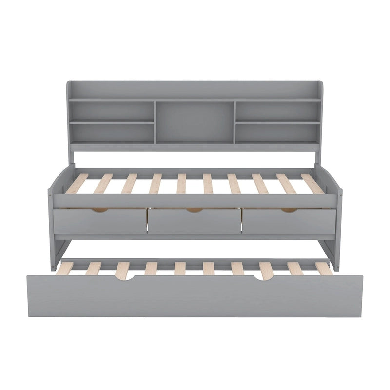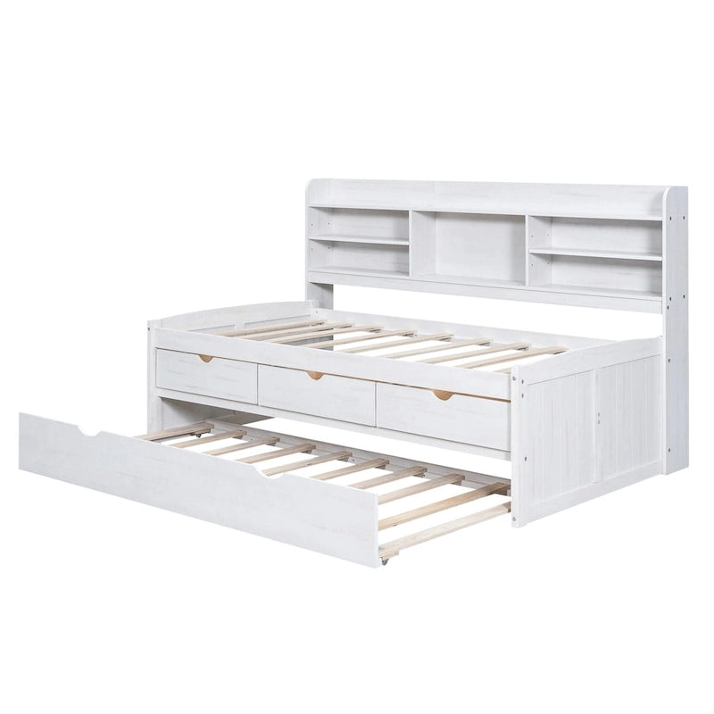 Crafted of solid pine wood and MDF in a smooth finish, this bed strikes a classic silhouette with a rectangular storage headboard. Functional and inviting, this bed with bookcase headboard and drawers has style and storage in spades. This wooden bed features three large storage drawers, a bookcase headboard, and a t-molding finish. And there is also a pull-out trundle for you to entertain overnight friends or guests.
