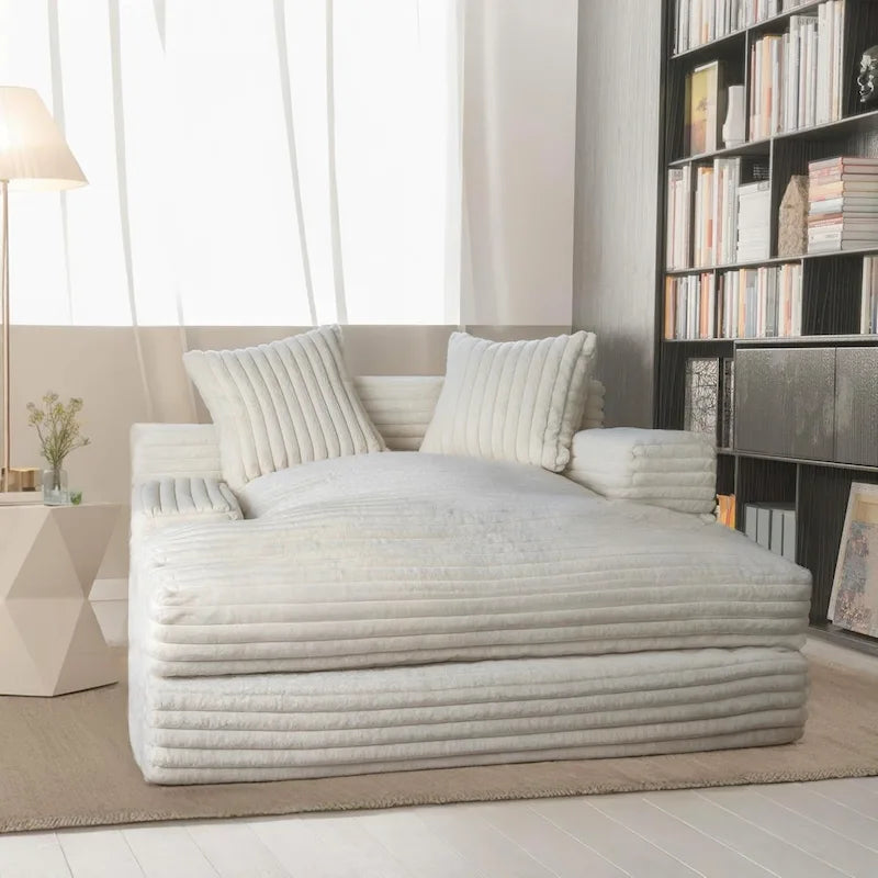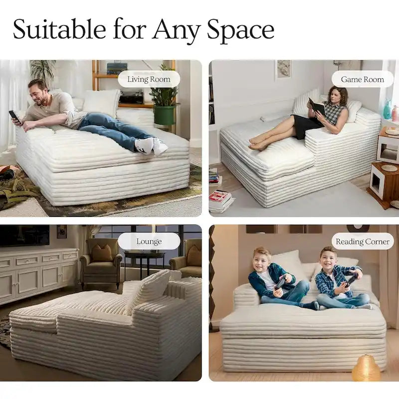 The oversized chaise lounge provides you with not only fashionable style but also ultra comfort. You can easily get this large floor loveseat assembled and move it from living room to bed room for gaming, reading or resting purposes. The premium polyester fiber filled seat cushion and throw pillows and the high-density foam arms and back create a ample space for lounging when you're enjoying some alone time or gathering with family.